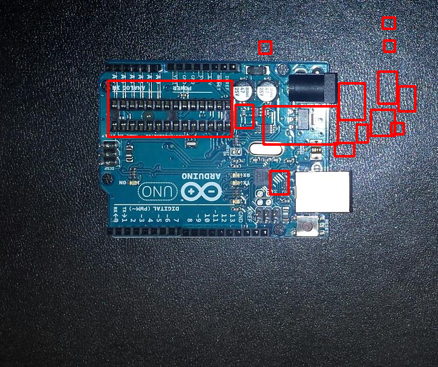 These are the differences found between pcb1.jpg and pcb2.jpg using cv2.TM_CCOEFF_NORMED